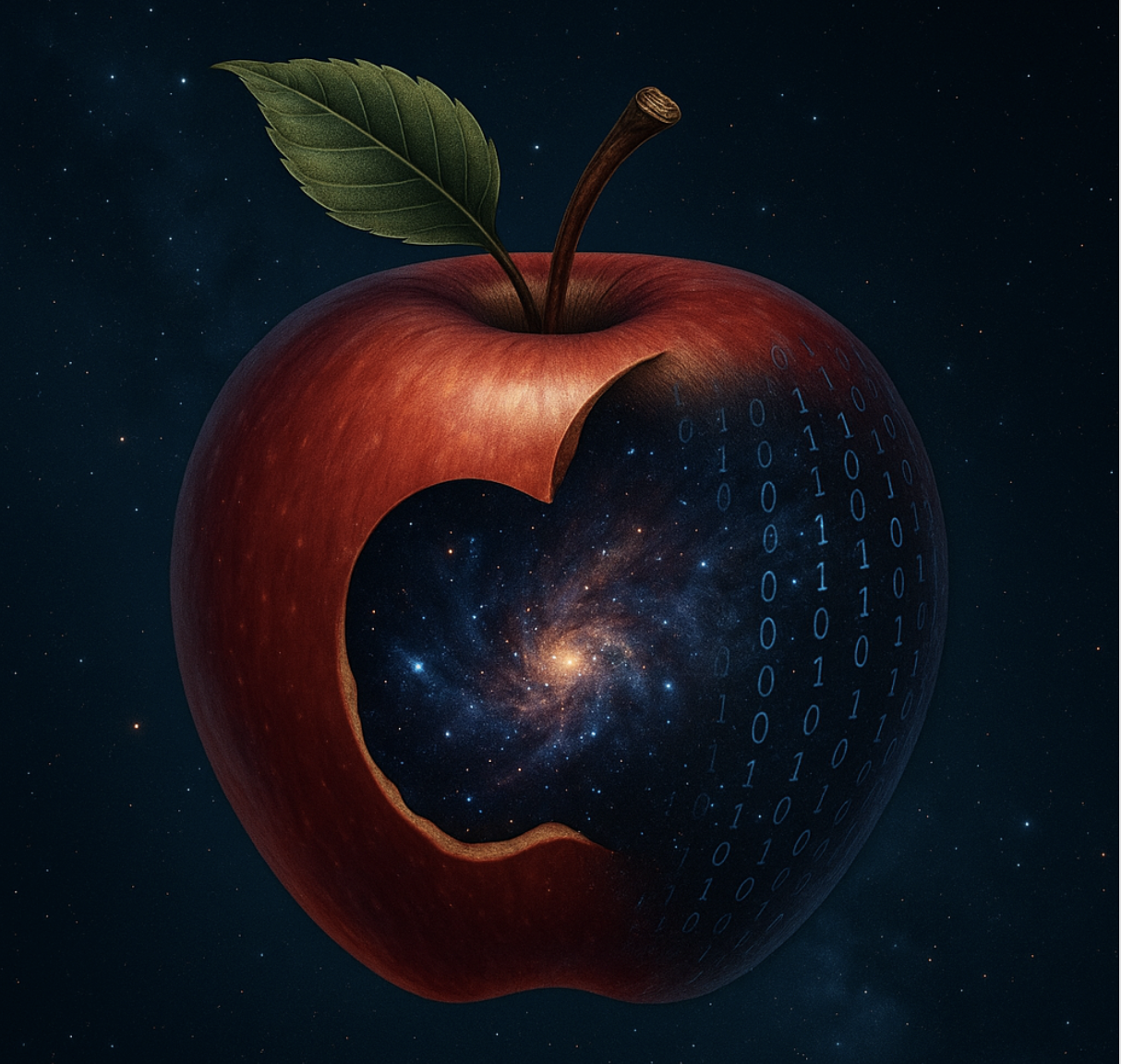 Công nghệ hiện đại thừa hưởng trực tiếp biểu tượng này.Quả táo bị cắn, gắn với cách chơi chữ “bite the byte”, không chỉ là thương hiệu. Nó gợi ý một sự bước qua: từ sinh học sang dữ liệu, từ hiện diện vật lý sang không gian nhận thức số.